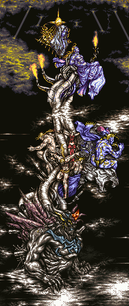 Tips: This is it, the final challenge. Make sure you choose your character order wisely. The Tower has three forms, which loosely resemble the former Three Statues: Poltergeist, Goddess, Doom. The first form has three parts: Long Arm, Short Arm, and Face. Kill the Face last and you'll have to endure a final Quake before moving on up. The second form has four different parts, popularly named Hit, Tiger, Tools, and Magic. Your best bet for this section would be multi-target attacks, especially Ultima (but I suggest you beat the final boss without using Ultima). Bahamut is always a good choice. If you manage to kill each part of the second form, you will then move on the final form of the Tower. This form has two parts, Sleep and Girl. Kill the Girl to keep her from healing Sleep. This form uses a lot of nonfocused and devastating multi-target attacks such as Merton, W Wind, and Train. Also watch out for Calmness, which will instantly put a character to death. Sleep will use Calmness multiple times as a final attack.